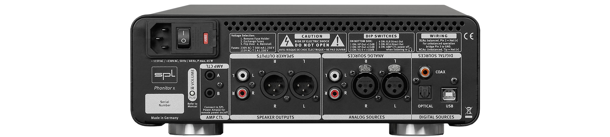 Phonitor x 提供标准立体声耳机接口(6.35mm 插头),以及支持平衡驱动的 4 针 XLR 插座。凭借强大的输出功率,可轻松驱动各种耳机。