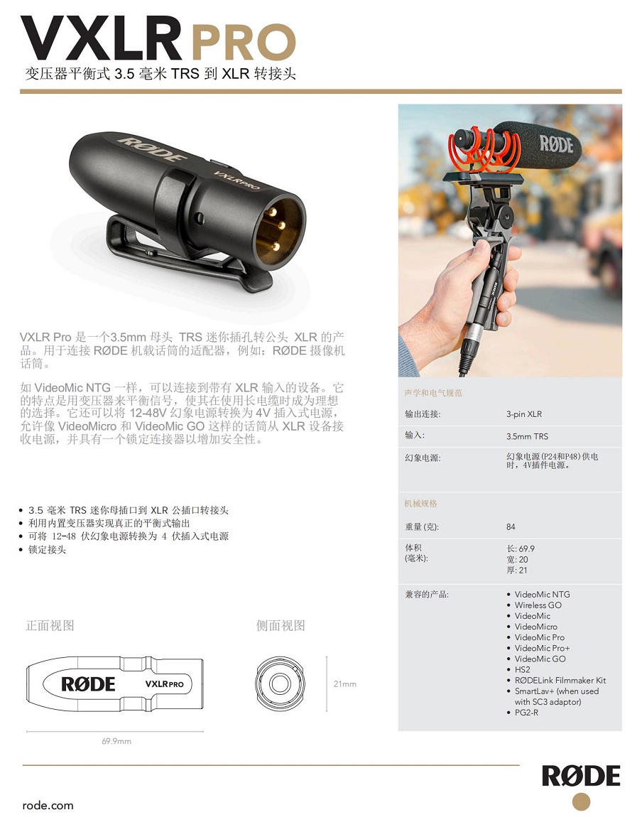 RØDE VXLR Pro 是一款 TRS 迷你母插口到 XLR 公插口转接头,用于将带有 3.5 毫米输出的 RØDE 话筒连接至带有 XLR 输入的设备。