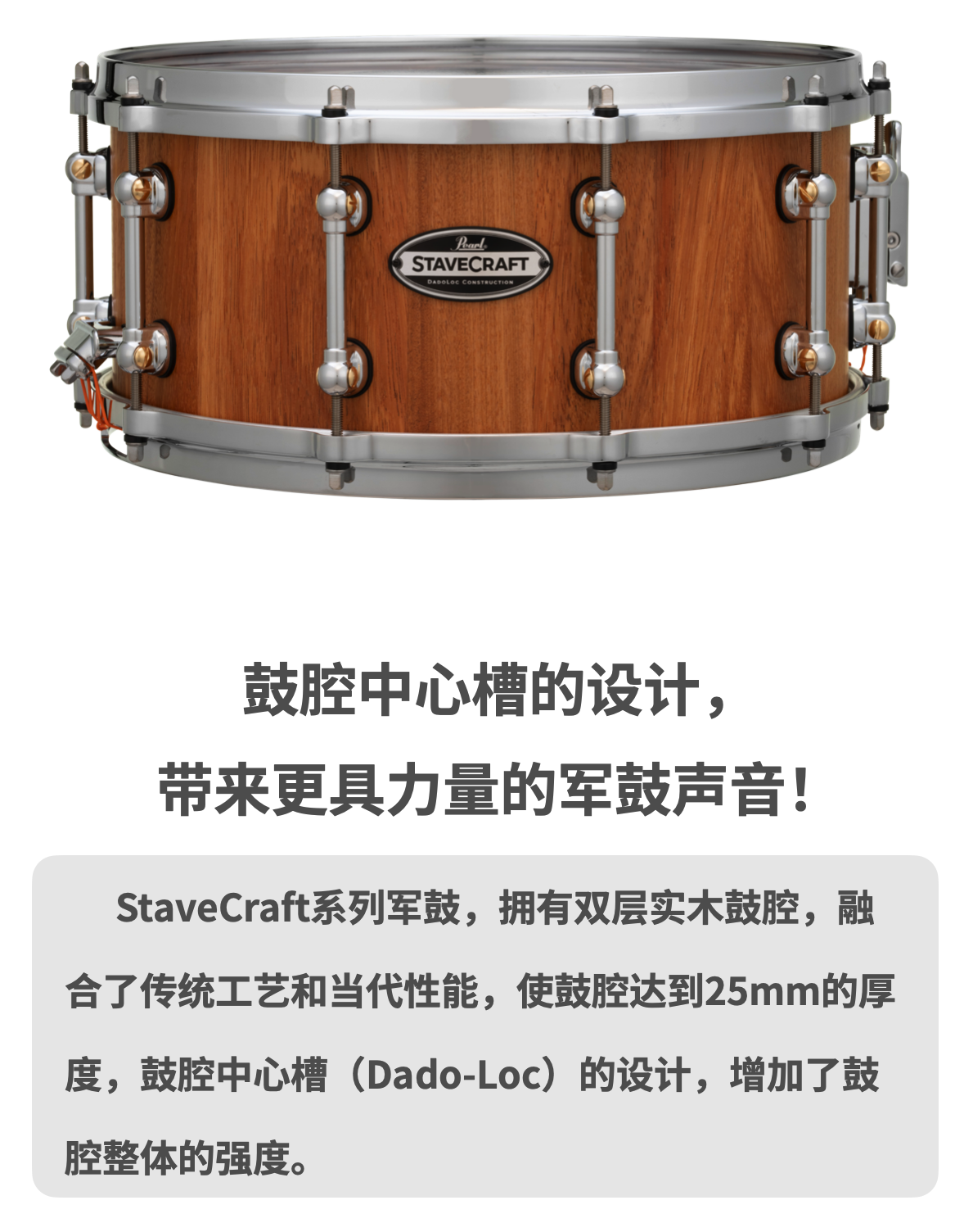Pearl(珍珠)StaveCraft系列实木拼接军鼓,具有实木明亮饱满的音色,融合了传统工艺与当代的性能。