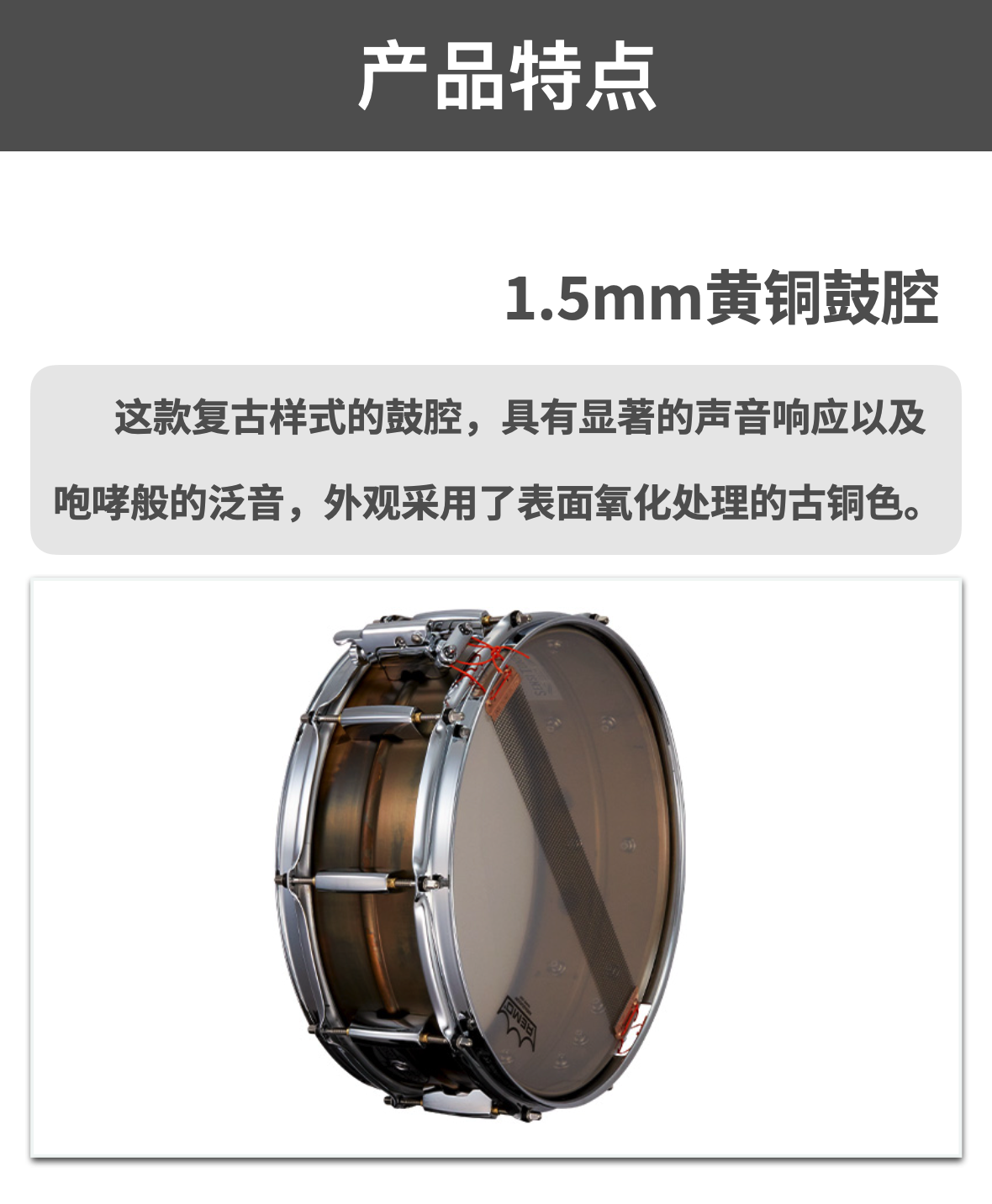 Pearl(珍珠)SensiTone Premium系列黄铜军鼓,经过精心的设计,同时将温暖与力量感的音色相结合,外观采用表面氧化处理,产生具有活力的古铜色,以现代功能呈现复古的味道!