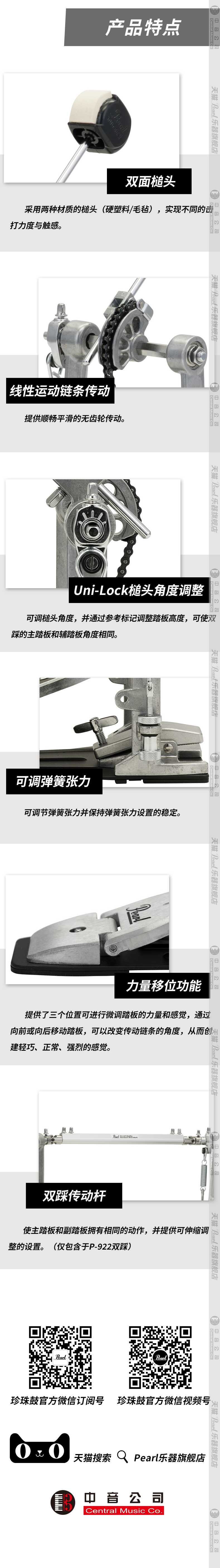 Pearl(珍珠)920系列踩槌,拥有力量移位(Power shifter)功能,并采用平滑的流线型单链条传动。